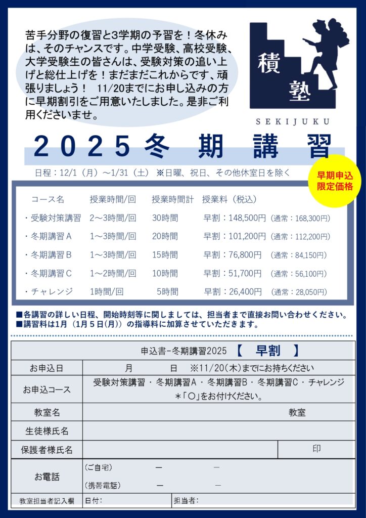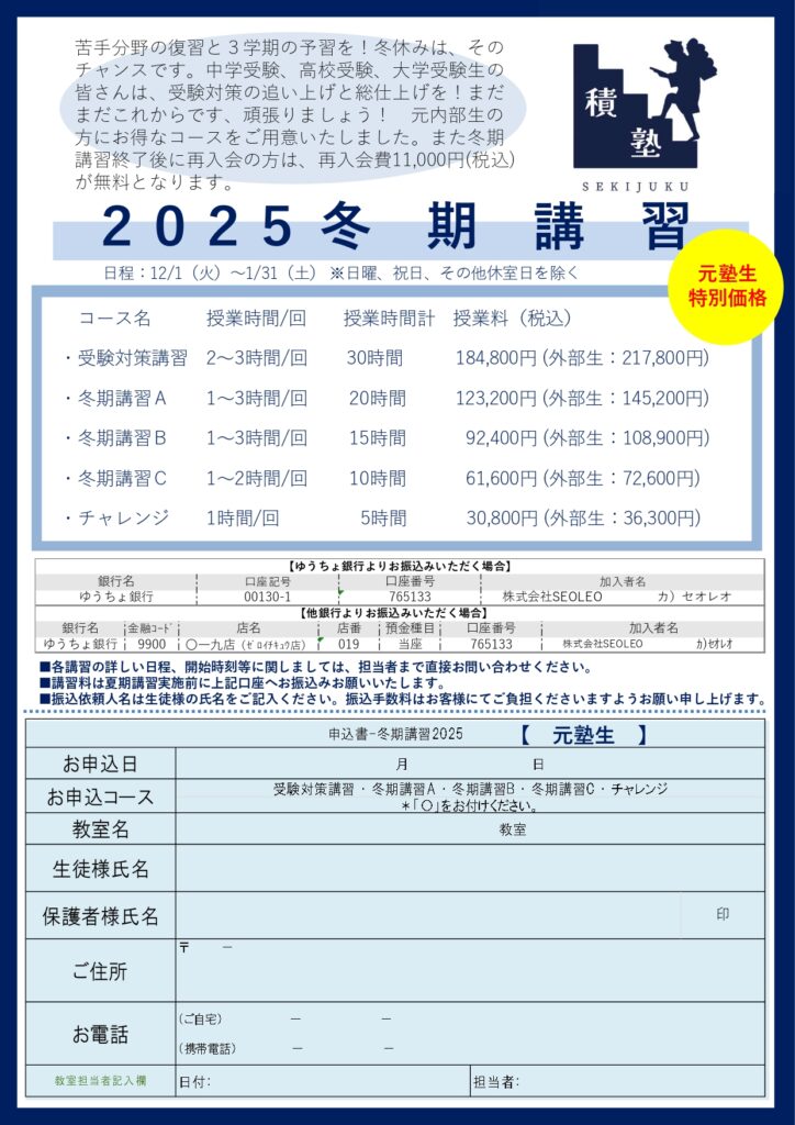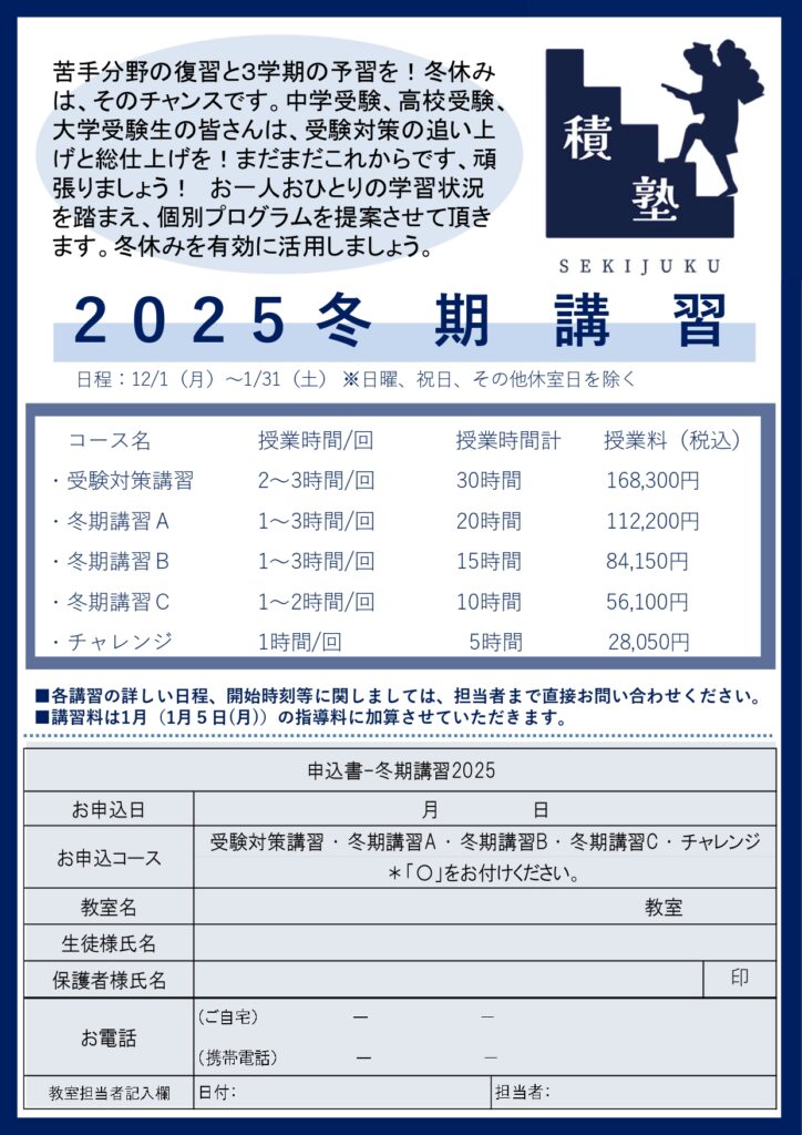オンライン学習塾「積塾」では、冬夏休みに向けて冬期講習を行います。