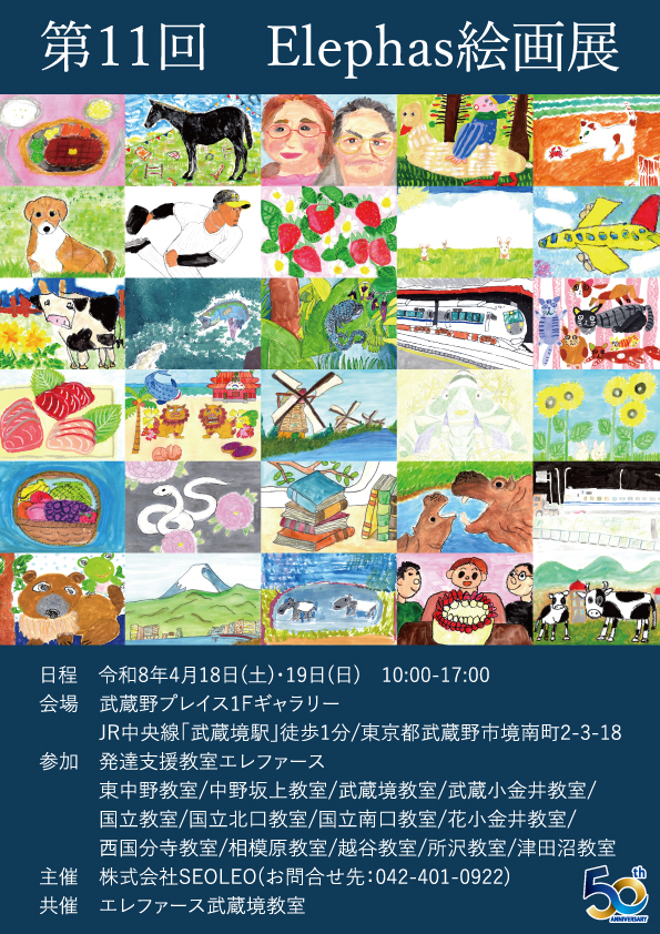 さてこの度、「第11回Elephas絵画展」を開催する運びとなりましたのでお知らせ致します。発達支援教室エレファース全12教室が参加し、東京都武蔵野市の武蔵野プレイスにて4月18日(土)、19日(日)の2日に亘り開催致します。出品者の日常や個性ある世界を感じていただけましたら幸いです。